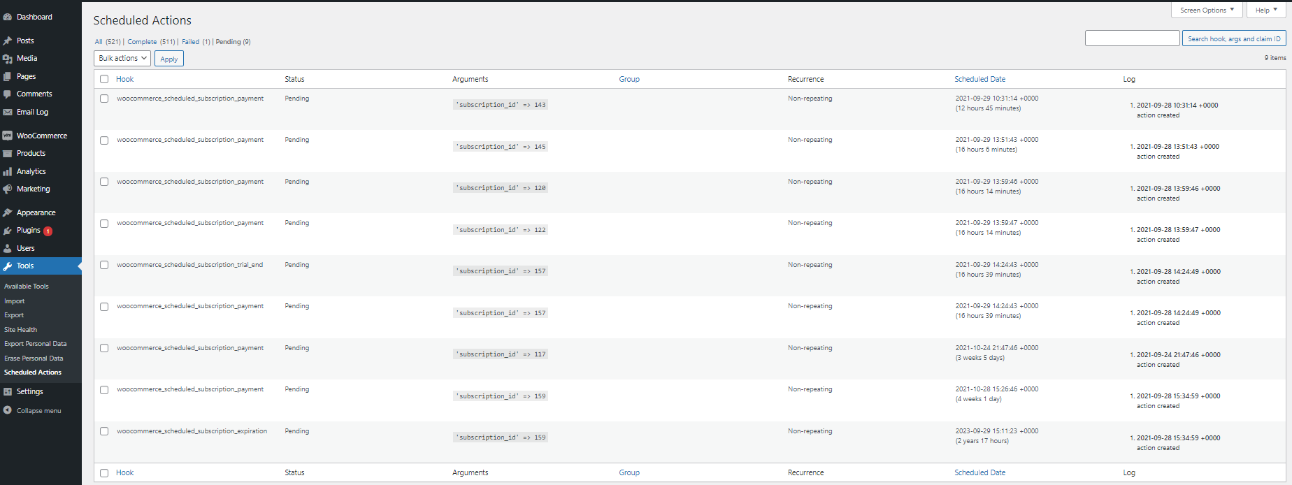 action_scheduler_run_queueevent should fire every minute. If it stays at "Now" without changing, your trigger is not landing; check Crontap's Activity tab for 4xx or 5xx responses. - WooCommerce, under Status, then Scheduled Actions. Filter by Past-due. The count should drop quickly after the first Crontap fire and stabilize near zero. Filter by Pending to see the next batch of actions queued up. Filter by Failed if anything threw an exception (separate problem; the queue is at least running).